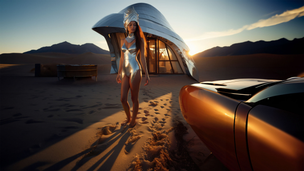Noch ersetzt die KI keine Modeaufnahmen, weil man sie bislang nicht mit der richtigen Kleidung füttern kann. Der gezeigte Style wurde von mir zu Demozwecken „entworfen“ (ich bin kein Modedesigner). Die Kombination KI plus Fotografie könnte schon jetzt klappen, nicht nur für Hintergründe. Sind Sie Fotograf*In? Für Kooperationen bin ich offen. Damit könnten Sie auch Ideen für reale Shootings vorab durchspielen. Oder  KI-Elemente wie Gebäude und Figuren ergänzen Ihre Fotos — für echte Hingucker! Interessiert? Mein Angebot gibt es hier!